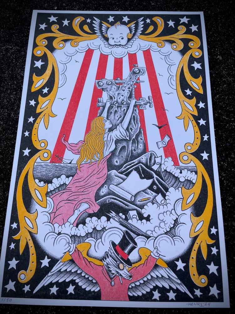 Printed in the RISO method so every one is slightly different. 11x17 Black, Red, & Golden Yellow inks. Edition of 50